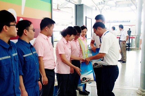當日,最高氣溫已攀升至38攝氏度,軌道公司董事長蔣建武等一行領導走訪了站廳、站臺、車控室、工班室等每一個軌道員工工作角落,向廣大員工不畏高溫、堅守崗位的辛勤勞動表示感謝,為他們送去夏季防暑降溫用品,并叮囑他們要始終把安全放在第一位,注意夏季高溫防范工作,確保每一位乘客平安出行。