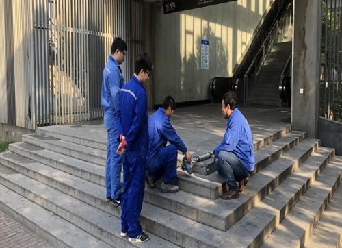 軌道公司對兆豐路站一號口樓梯臺階面進行破損修復(fù)工作